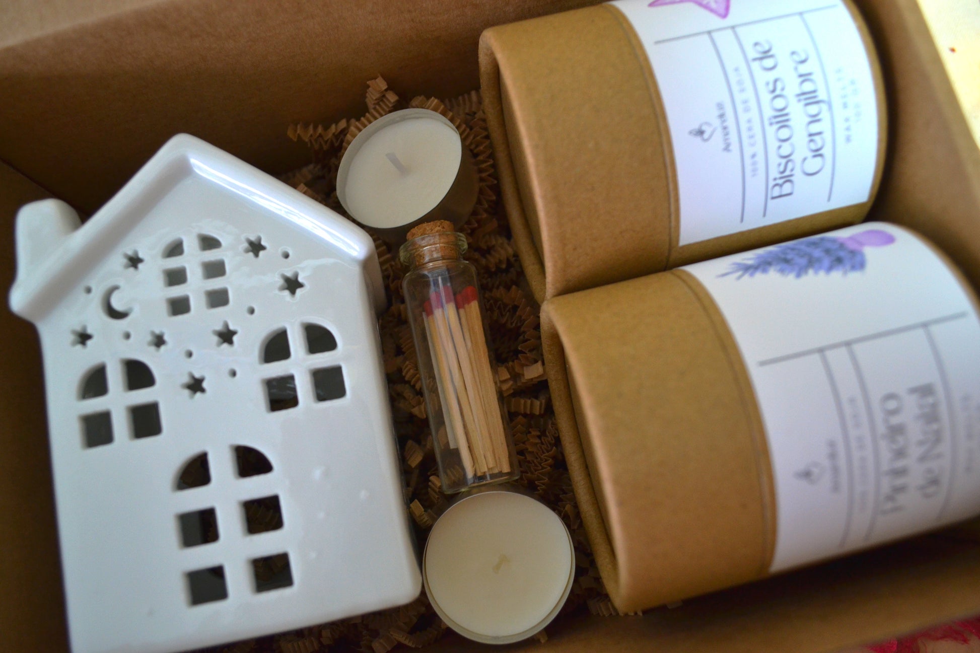 Inclui um queimador em cerâmica com a forma de uma linda casa, um frasco de fósforos artesanais, duas velas de chá e dois wax melts de aromas de outono ou de Natal num caixa kraft.
