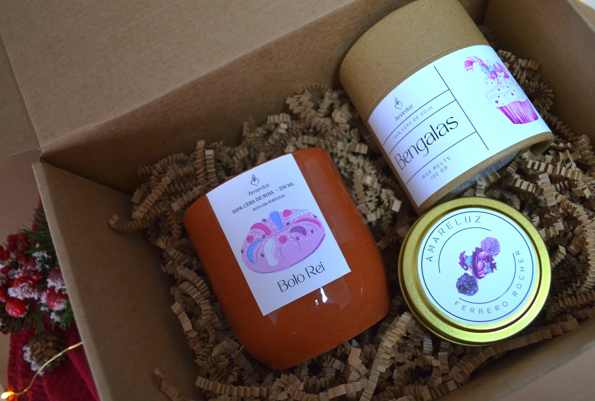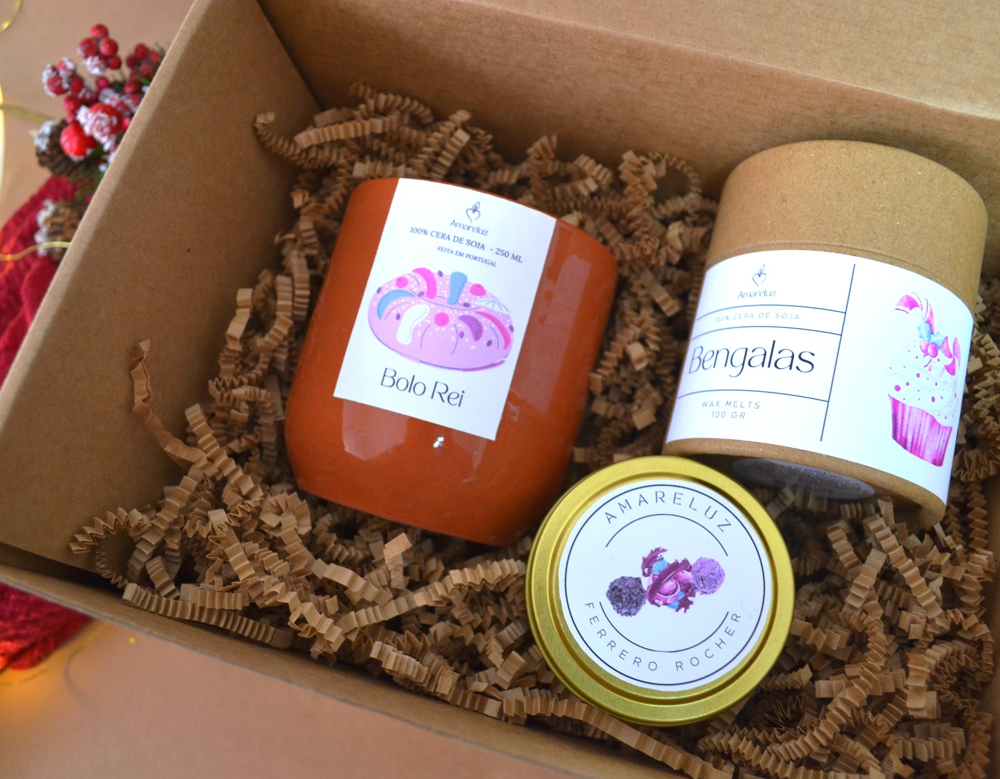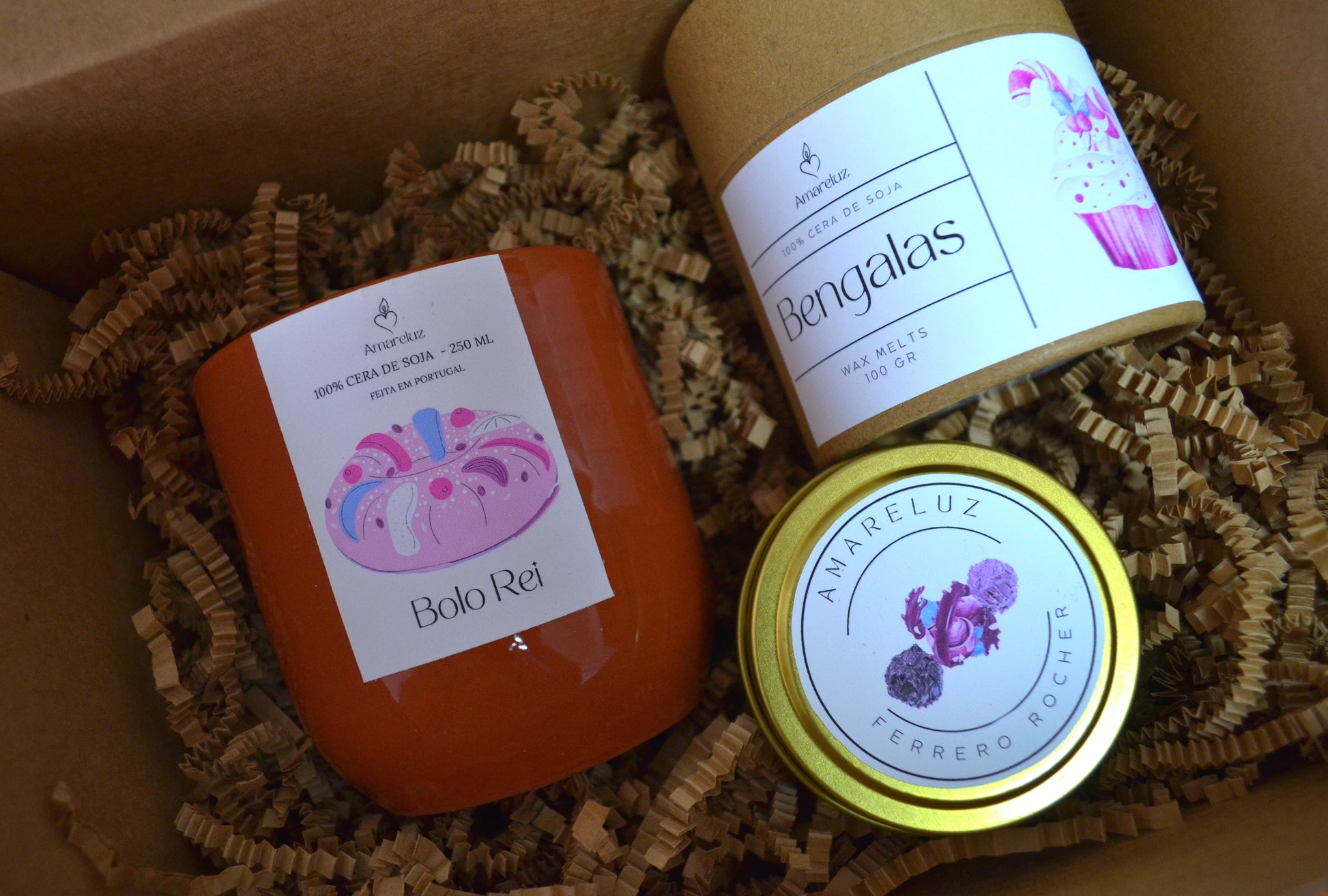 Ele reúne uma vela em copo de barro Bolo Rei, uma vela dourada de 100 ml com aroma de Ferrero Rocher e uma caixa de wax melts de bengalas natalícias, que perfumam o espaço com notas doces e envolventes.