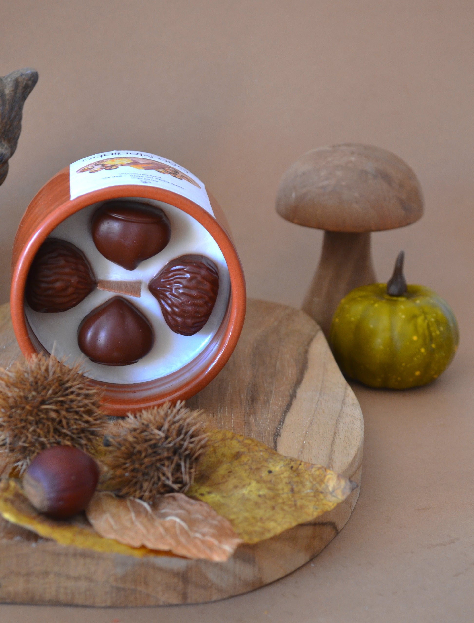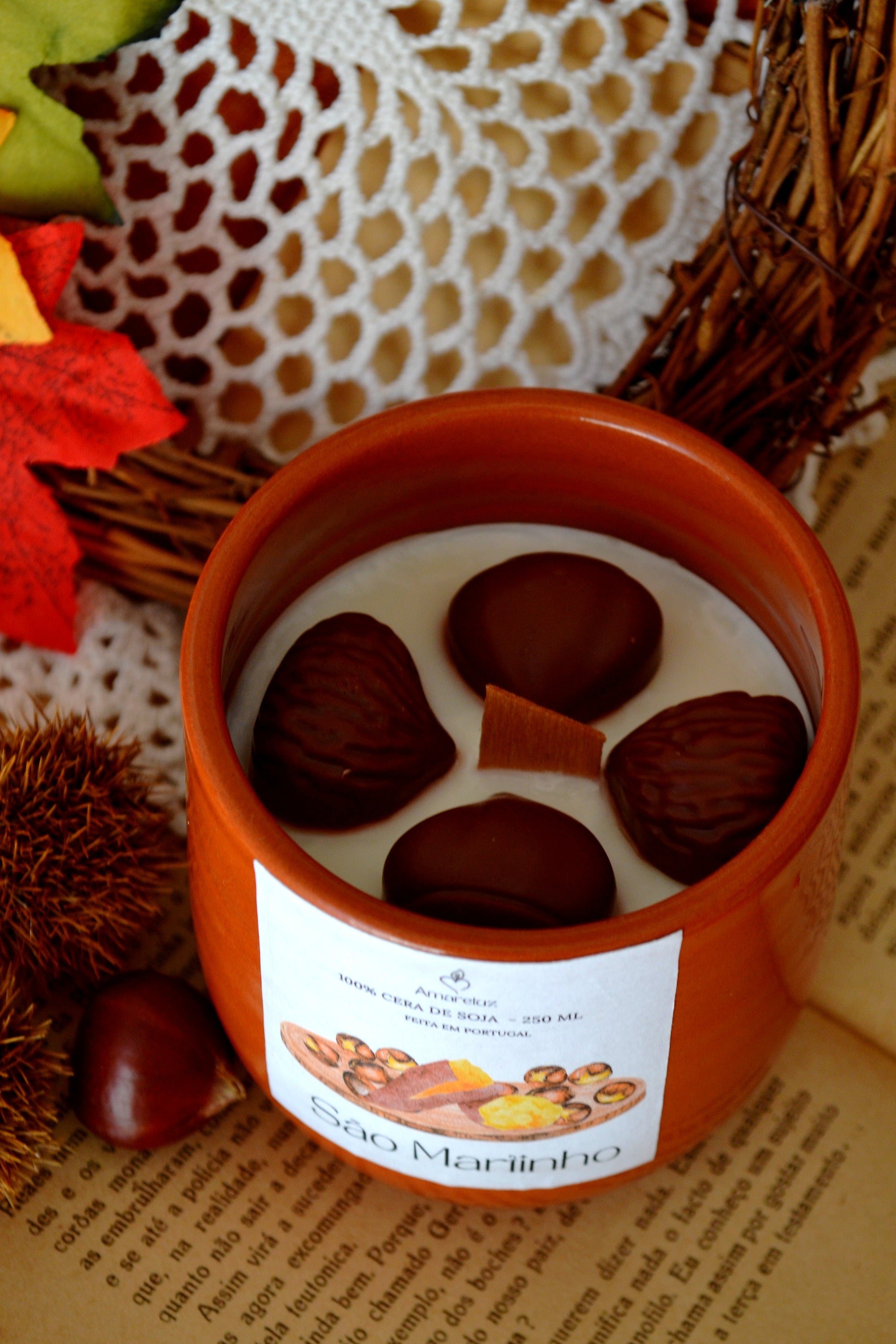 Decorada com castanhas em cera no topo, esta vela em copo de barro é mais do que um aroma: é um convite a celebrar tradições, a aquecer a alma e a transformar memórias de infância em instantes de aconchego dentro de casa.